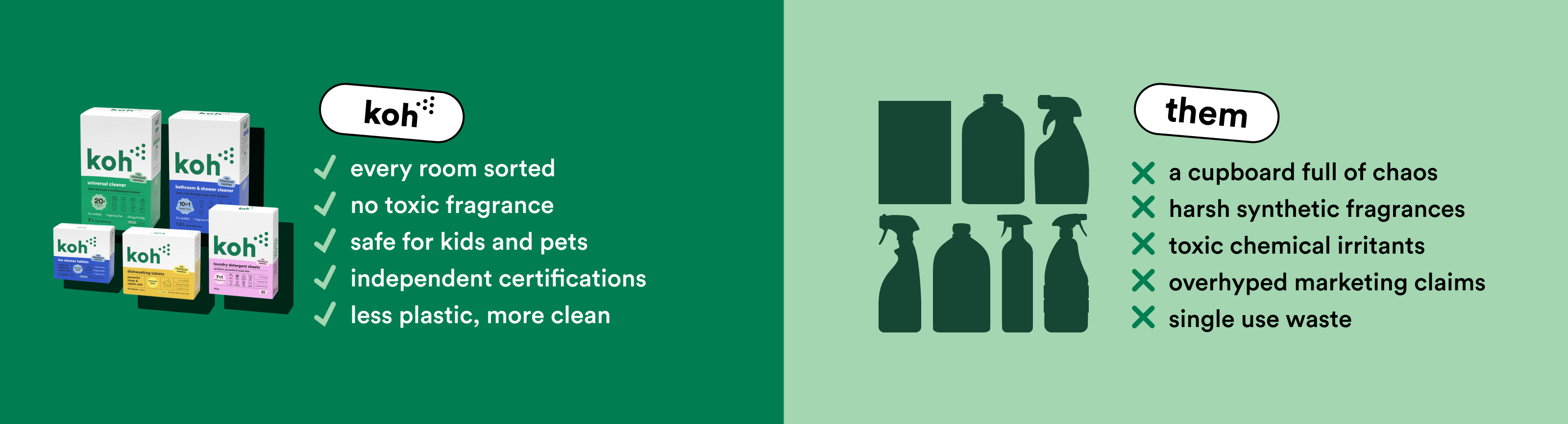 Like it or not, ‘green’ products don’t always have the best reputation. Organic ingredients are friendly on the skin, but sometimes a little too friendly on grime. Koh ticks both boxes: our formulas tackle mess instantly, without stripping your skin or making you wheeze. Bathroom, kitchen, or crayon on the wall; Koh cleans it all — fast.