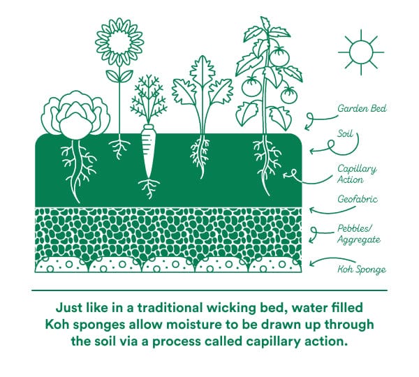 Using Koh’s 100% biodegradable Dish Sponges (made from wood pulp) we’ve designed a layered garden bed. The self watering design, reduces water usage and creates a happier home for your plants!