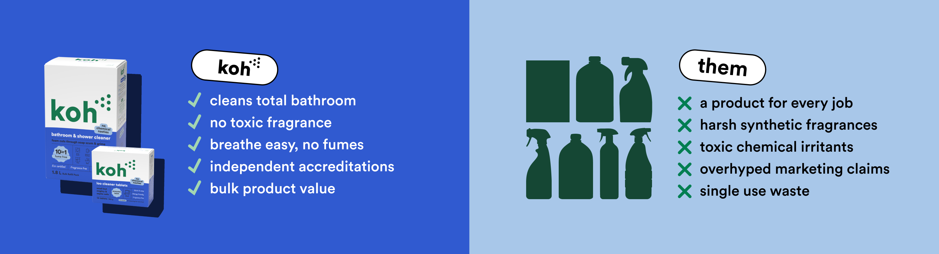 Like it or not, ‘green’ products don’t always have the best reputation. Organic ingredients are friendly on the skin, but sometimes a little too friendly on grime. Koh ticks both boxes: our formulas tackle mess instantly, without stripping your skin or making you wheeze. Bathroom, kitchen, or crayon on the wall; Koh cleans it all — fast.