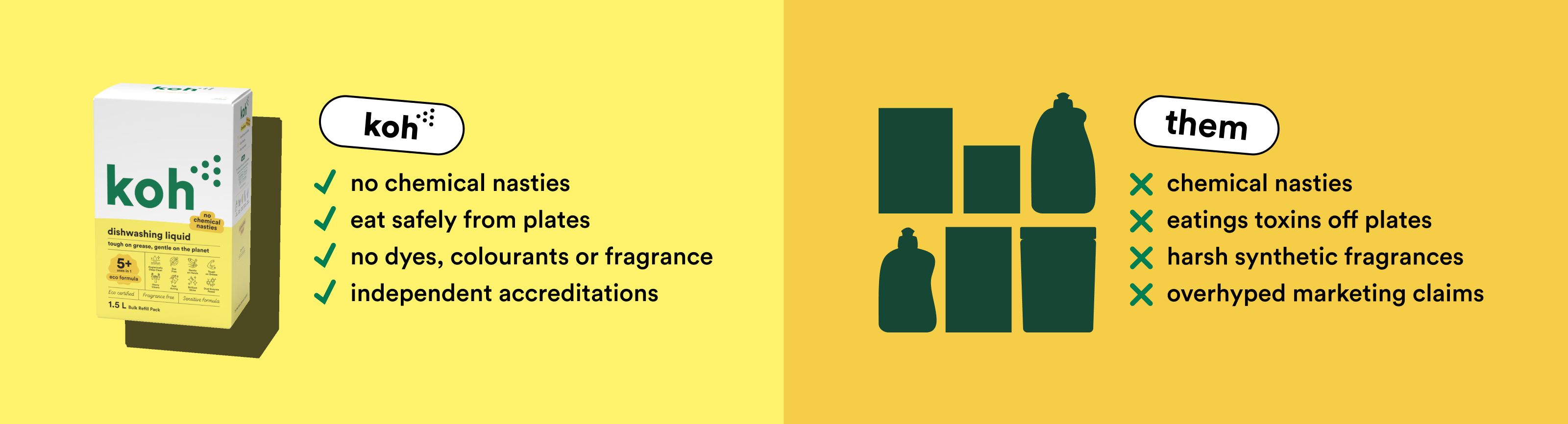 Like it or not, ‘green’ products don’t always have the best reputation. Organic ingredients are friendly on the skin, but sometimes a little too friendly on grime. Koh ticks both boxes: our formulas tackle mess instantly, without stripping your skin or making you wheeze. Bathroom, kitchen, or crayon on the wall; Koh cleans it all — fast.