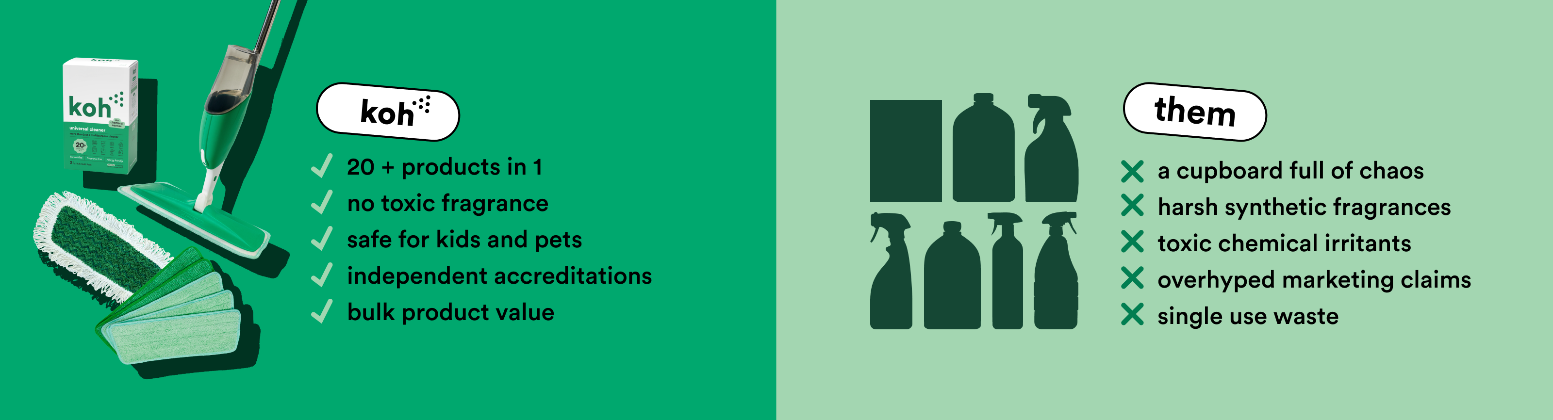 Like it or not, ‘green’ products don’t always have the best reputation. Organic ingredients are friendly on the skin, but sometimes a little too friendly on grime. Koh ticks both boxes: our formulas tackle mess instantly, without stripping your skin or making you wheeze. Bathroom, kitchen, or crayon on the wall; Koh cleans it all — fast.