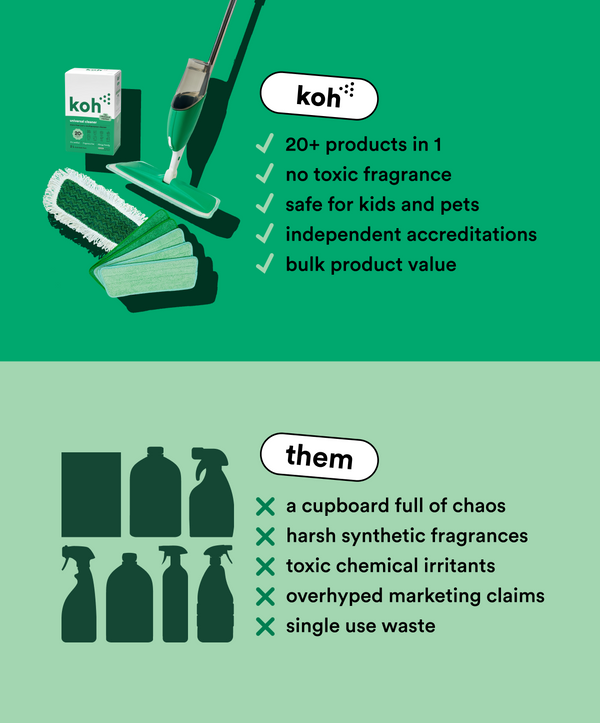 Koh fights dirty by delivering a simple, safe, sustainable, and super effective cleaning solution that rejects cleaning as a chore; instead empowering users to seek the joy of a clean, green home. Read on for more about our simple, safe, sustainable, super effective (and smart) philosophy: