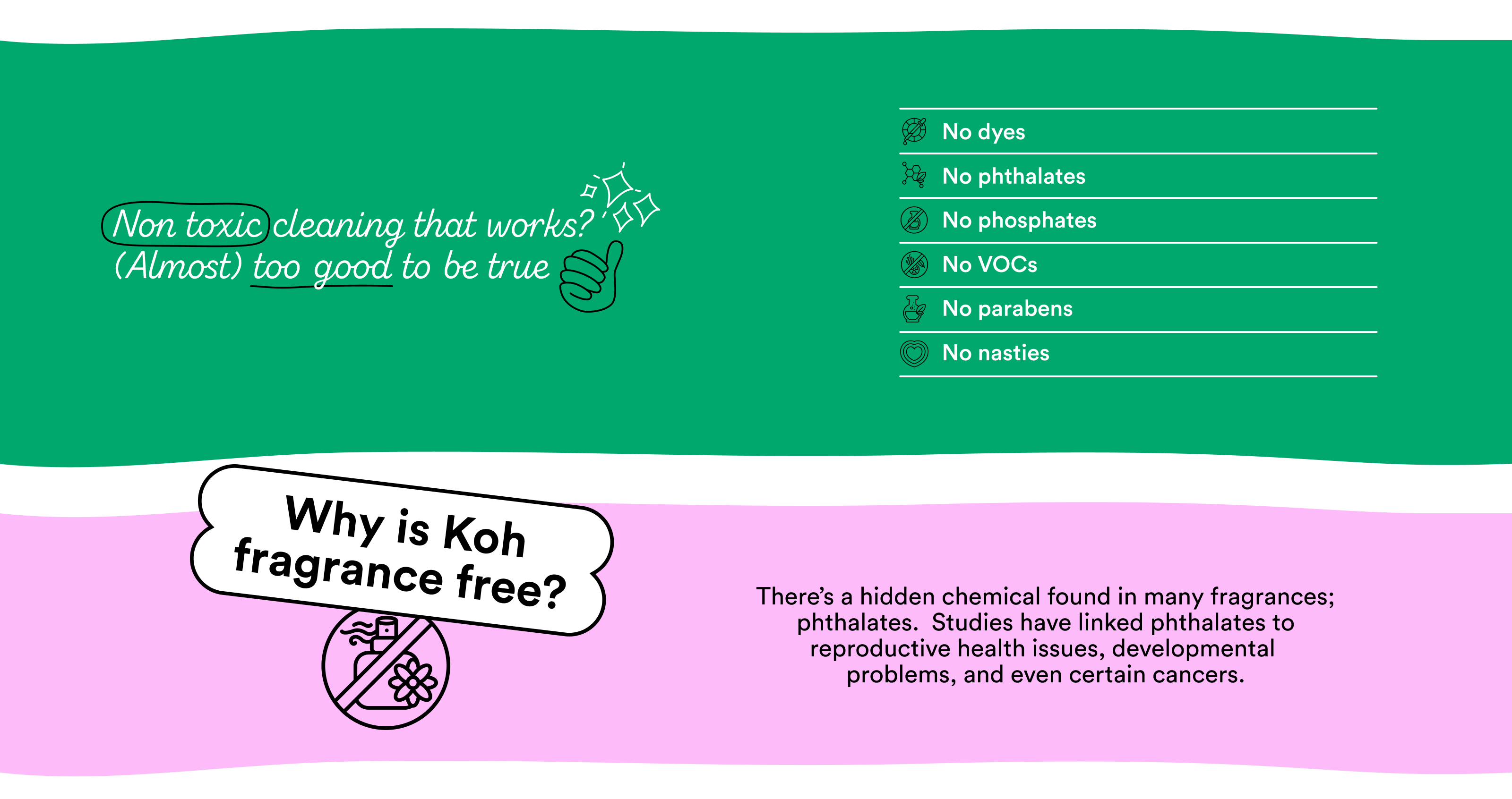 Like it or not, ‘green’ products don’t always have the best reputation. Organic ingredients are friendly on the skin, but sometimes a little too friendly on grime. Koh ticks both boxes: our formulas tackle mess instantly, without stripping your skin or making you wheeze. Bathroom, kitchen, or crayon on the wall; Koh cleans it all — fast.