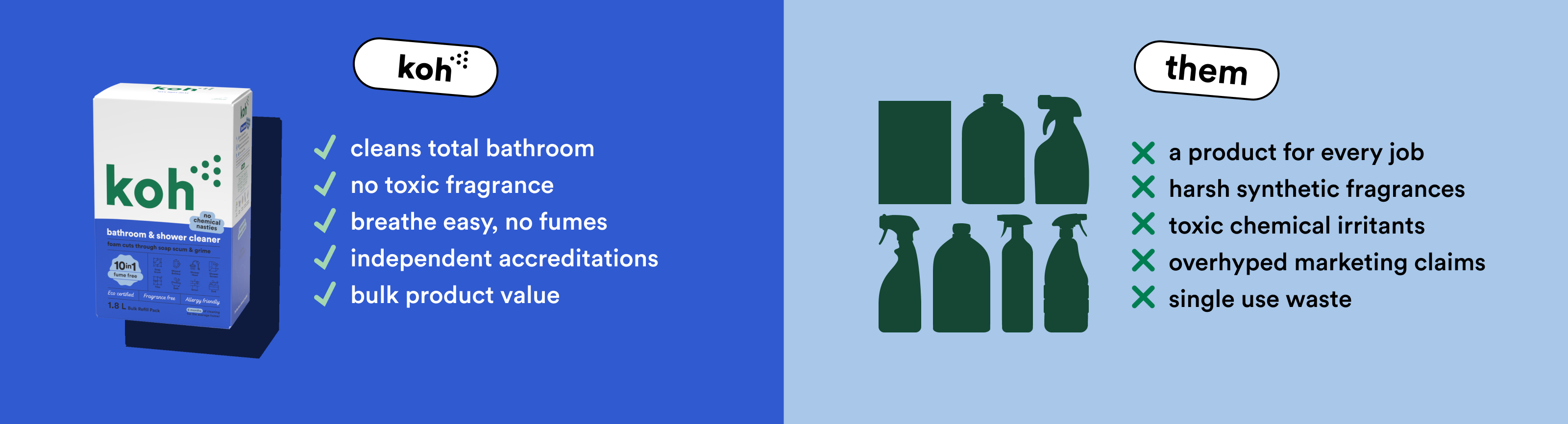 Like it or not, ‘green’ products don’t always have the best reputation. Organic ingredients are friendly on the skin, but sometimes a little too friendly on grime. Koh ticks both boxes: our formulas tackle mess instantly, without stripping your skin or making you wheeze. Bathroom, kitchen, or crayon on the wall; Koh cleans it all — fast.