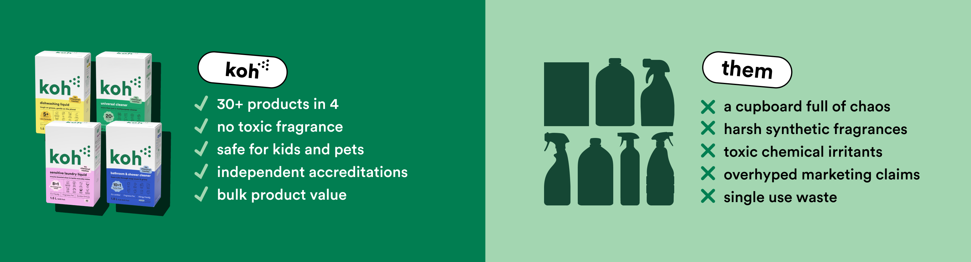 Like it or not, ‘green’ products don’t always have the best reputation. Organic ingredients are friendly on the skin, but sometimes a little too friendly on grime. Koh ticks both boxes: our formulas tackle mess instantly, without stripping your skin or making you wheeze. Bathroom, kitchen, or crayon on the wall; Koh cleans it all — fast.