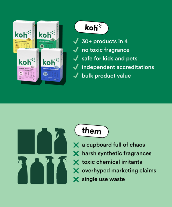 We believe a clean home shouldn’t come at the cost of the environment around us. That’s why Koh's cleaning products are packaged to minimise as much waste as possible and use tools that are reusable, refillable and very long-lasting. What’s on the inside counts too, Koh cleaning products are certified by GECA, Australia’s only independent, not-for-profit sustainability and environmental certification as a good environmental choice.