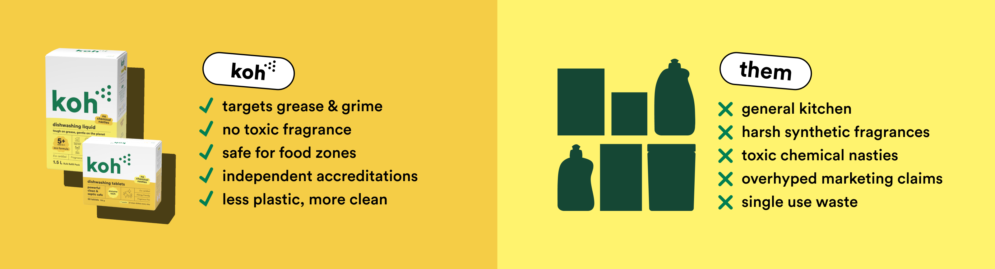 Like it or not, ‘green’ products don’t always have the best reputation. Organic ingredients are friendly on the skin, but sometimes a little too friendly on grime. Koh ticks both boxes: our formulas tackle mess instantly, without stripping your skin or making you wheeze. Bathroom, kitchen, or crayon on the wall; Koh cleans it all — fast.