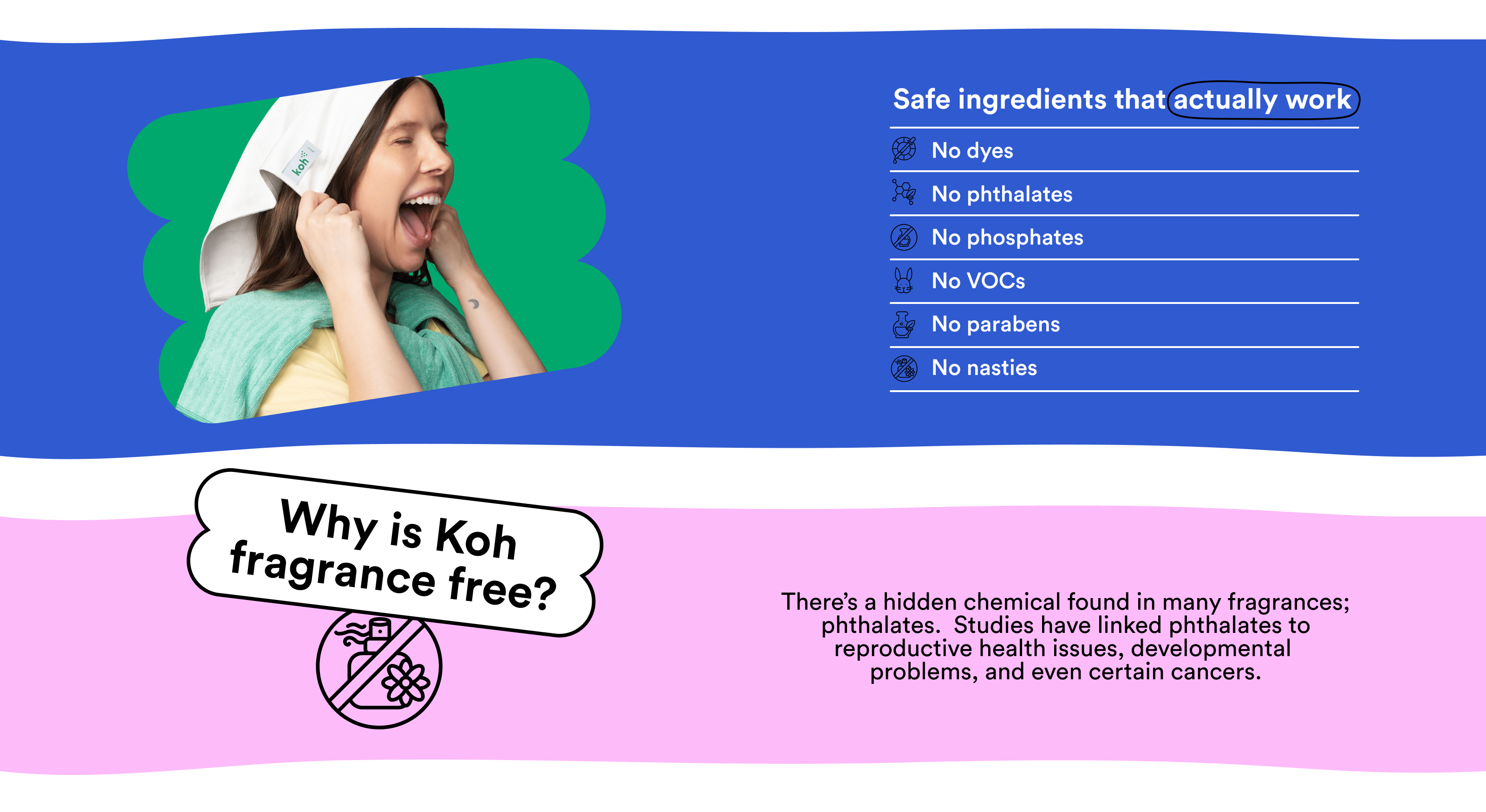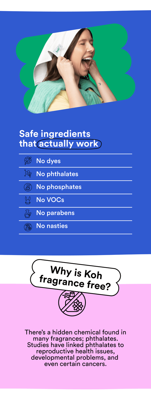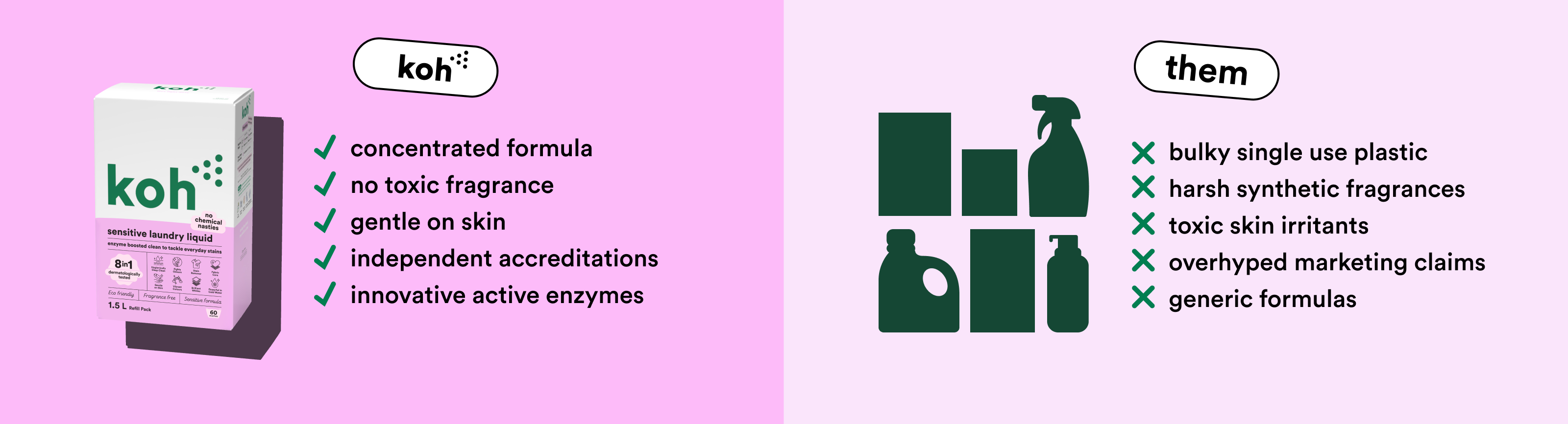 Koh products are proudly fragrance free and independently verified by The National Asthma Council Australia’s Sensitive Choice program and Allergy UK to be suitable for those suffering asthma and allergies.