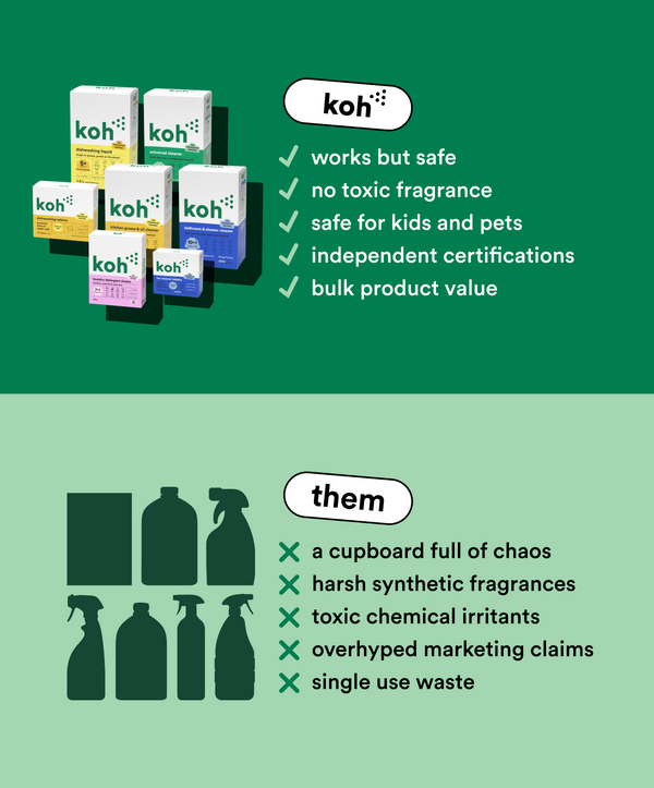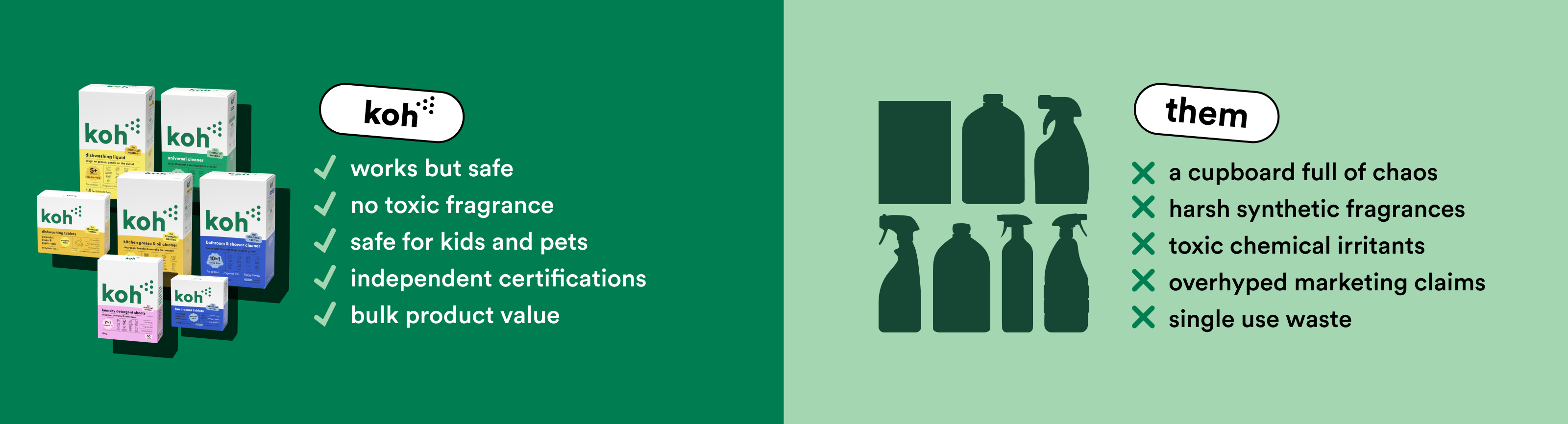 Like it or not, ‘green’ products don’t always have the best reputation. Organic ingredients are friendly on the skin, but sometimes a little too friendly on grime. Koh ticks both boxes: our formulas tackle mess instantly, without stripping your skin or making you wheeze. Bathroom, kitchen, or crayon on the wall; Koh cleans it all — fast.