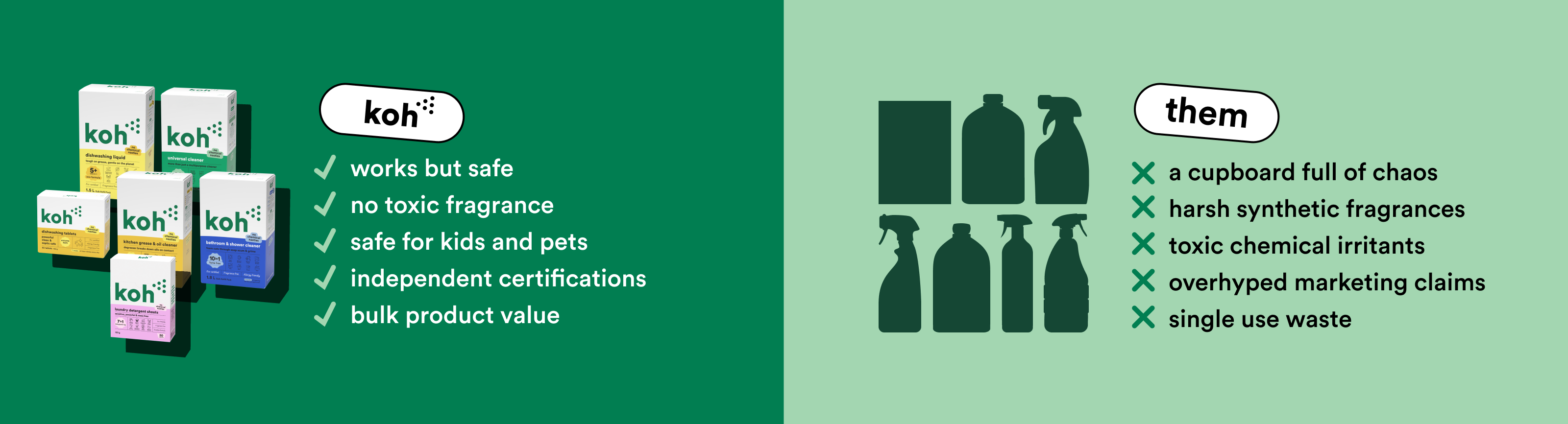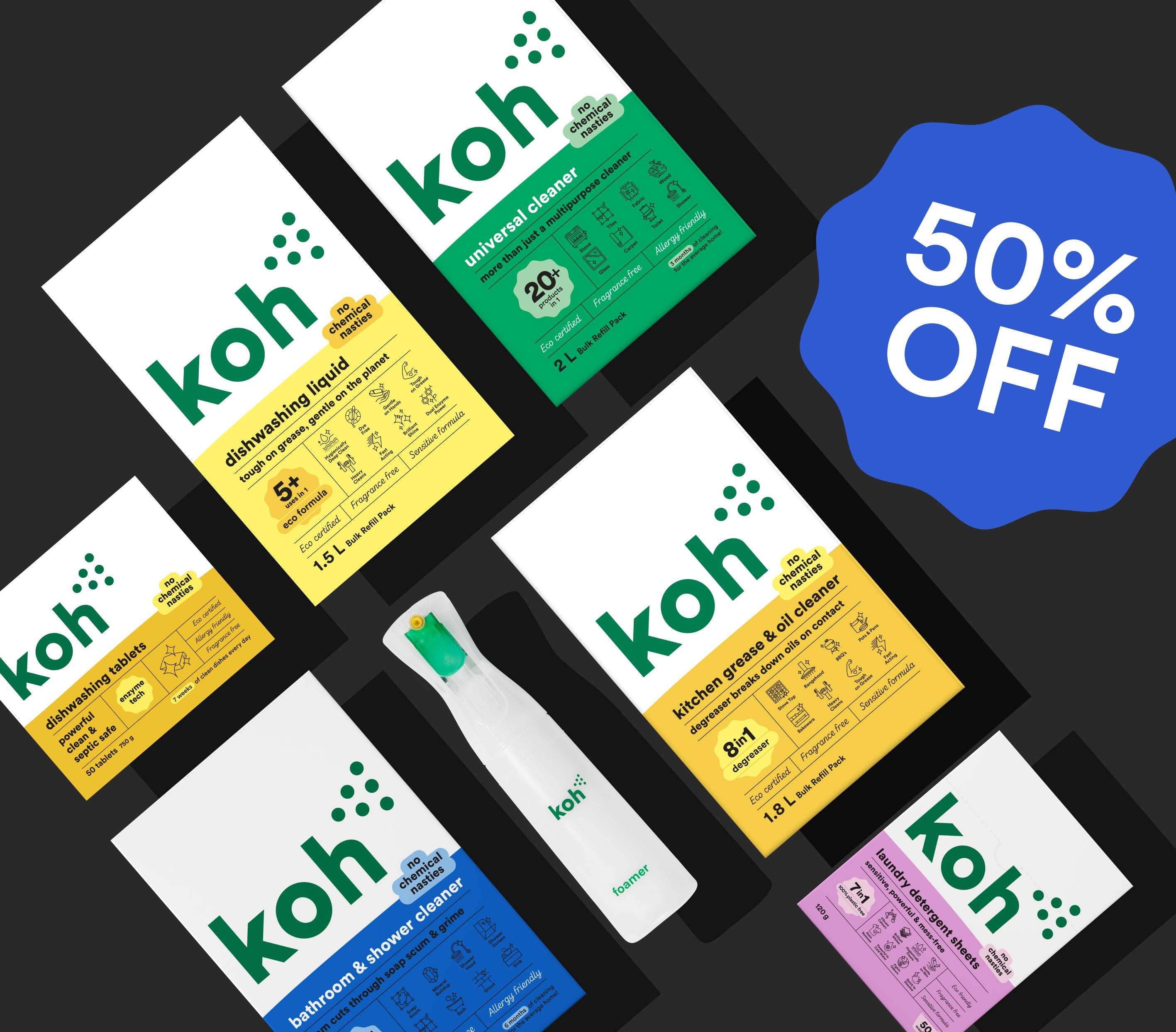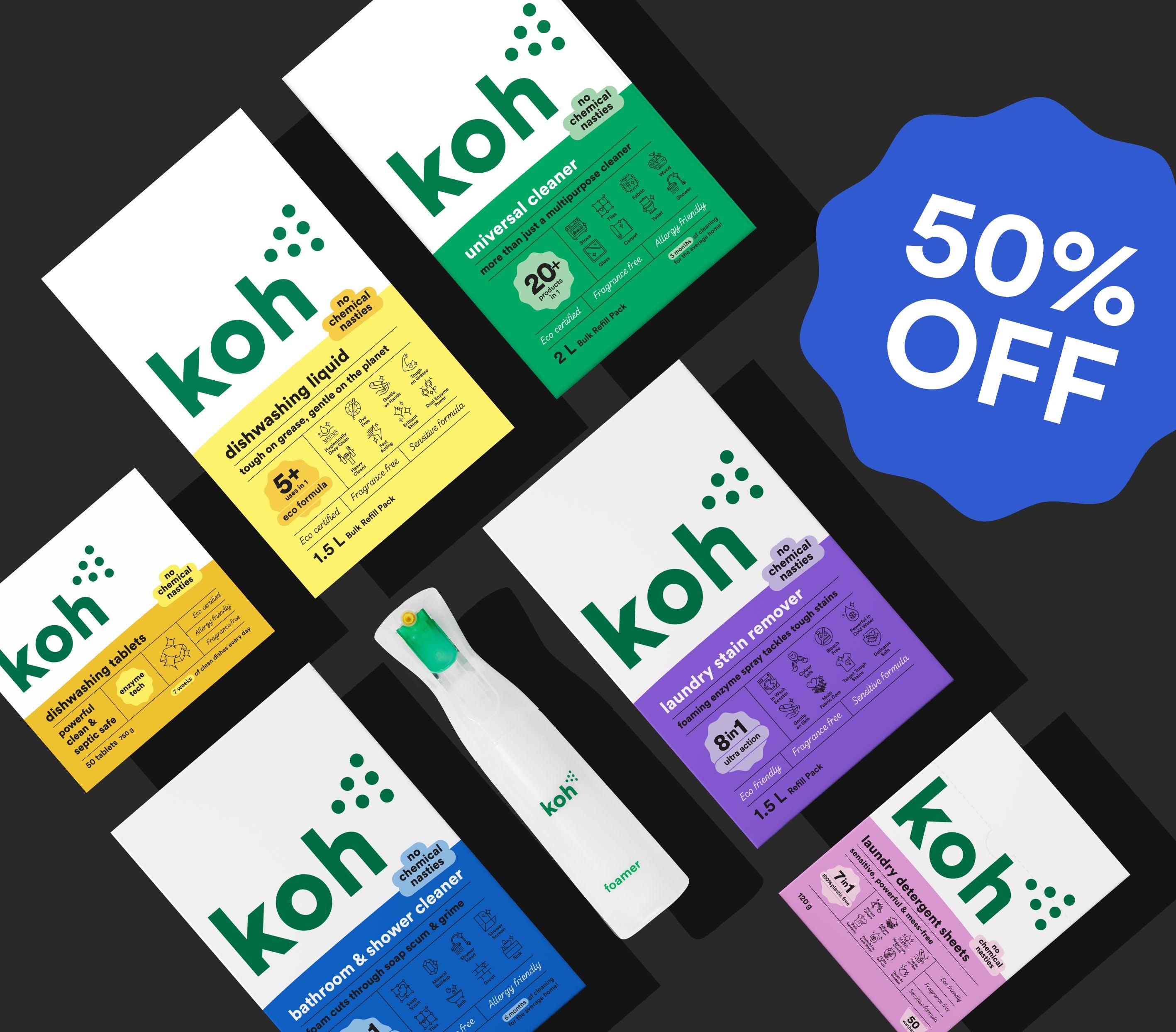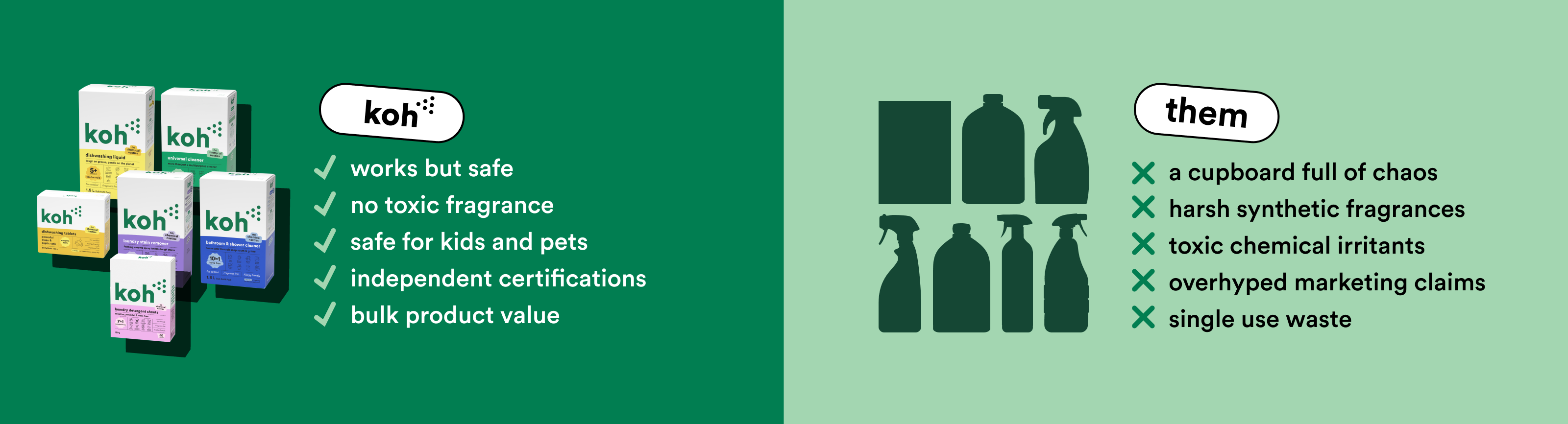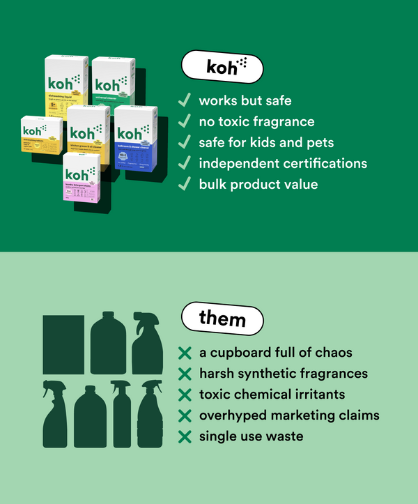 Like it or not, ‘green’ products don’t always have the best reputation. Organic ingredients are friendly on the skin, but sometimes a little too friendly on grime. Koh ticks both boxes: our formulas tackle mess instantly, without stripping your skin or making you wheeze. Bathroom, kitchen, or crayon on the wall; Koh cleans it all — fast.