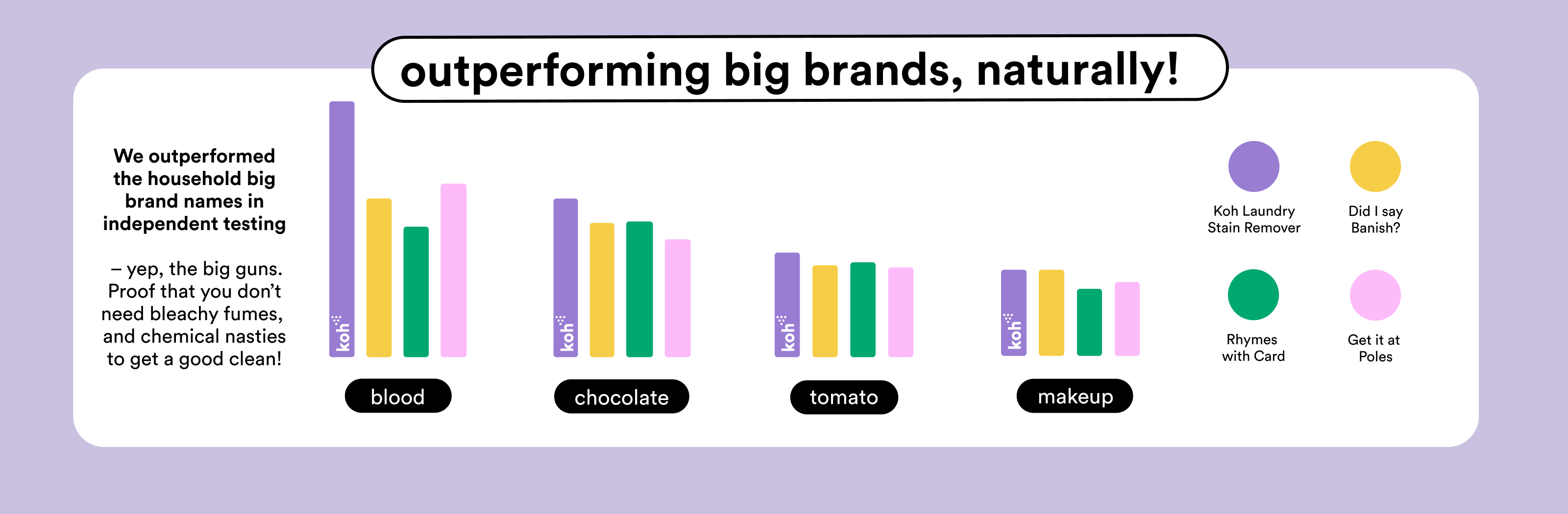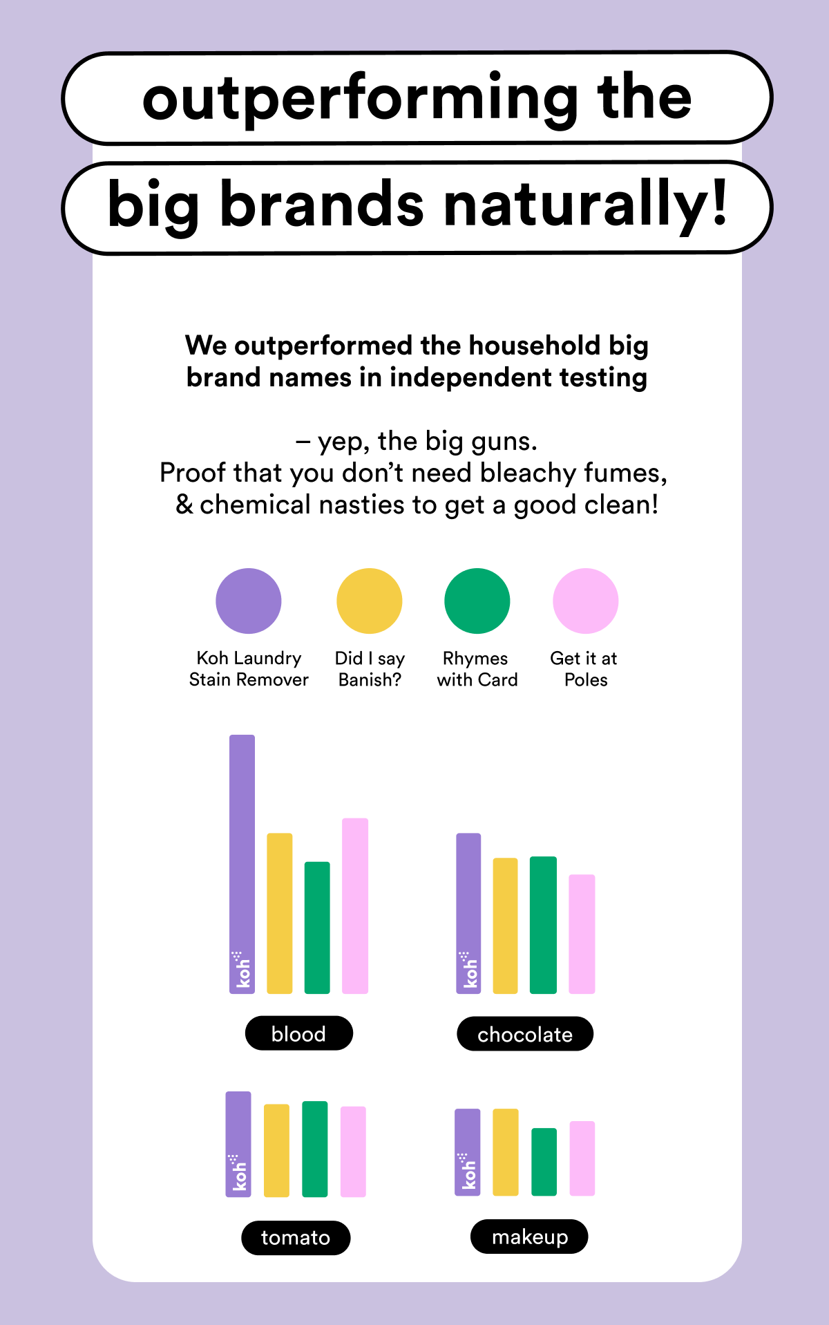Like it or not, ‘green’ products don’t always have the best reputation. Organic ingredients are friendly on the skin, but sometimes a little too friendly on grime. Koh ticks both boxes: our formulas tackle mess instantly, without stripping your skin or making you wheeze. Bathroom, kitchen, or crayon on the wall; Koh cleans it all — fast.