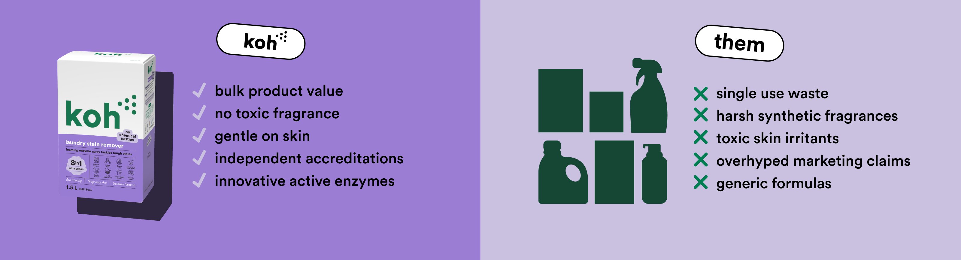 Like it or not, ‘green’ products don’t always have the best reputation. Organic ingredients are friendly on the skin, but sometimes a little too friendly on grime. Koh ticks both boxes: our formulas tackle mess instantly, without stripping your skin or making you wheeze. Bathroom, kitchen, or crayon on the wall; Koh cleans it all — fast.