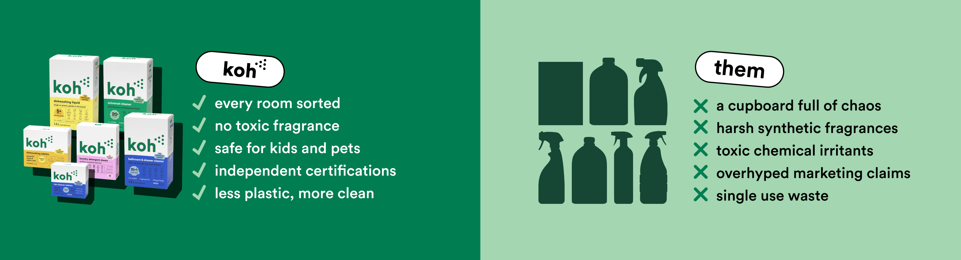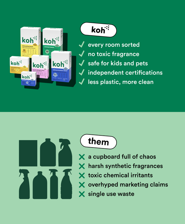 Like it or not, ‘green’ products don’t always have the best reputation. Organic ingredients are friendly on the skin, but sometimes a little too friendly on grime. Koh ticks both boxes: our formulas tackle mess instantly, without stripping your skin or making you wheeze. Bathroom, kitchen, or crayon on the wall; Koh cleans it all — fast.