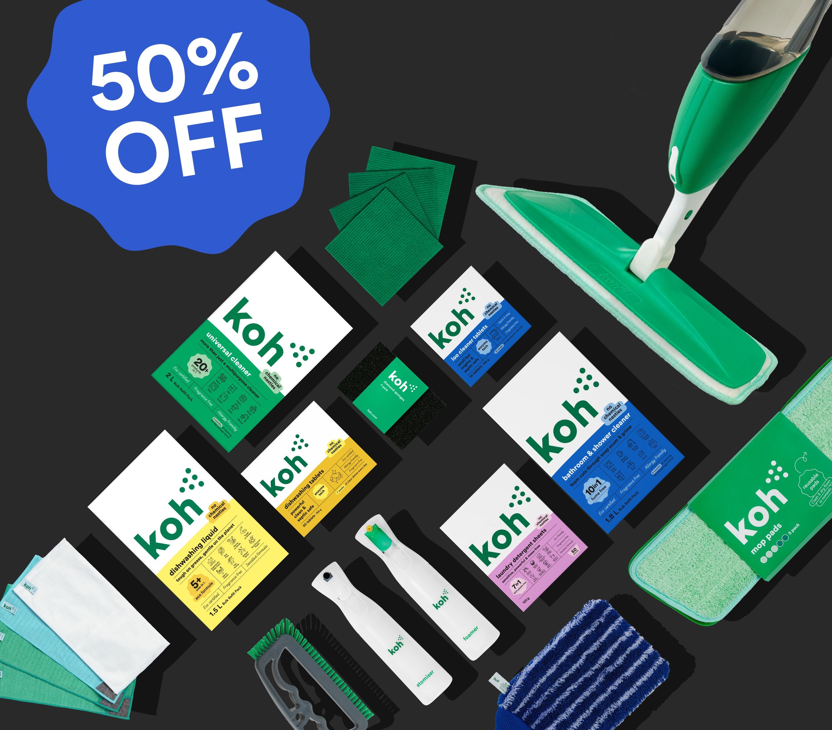 The cleaning industry has long leaned on hardcore chemicals delivered with plenty of elbow grease. At Koh, we believe in less leaning, and more cleaning. That’s why we’ve doubled down on innovation, to develop our own (scientifically tested) products, delivered with tools that make your clean a dream. From atomisers that use less, to loo blades that swipe more, we’ll never stop working hard to make your clean easy.